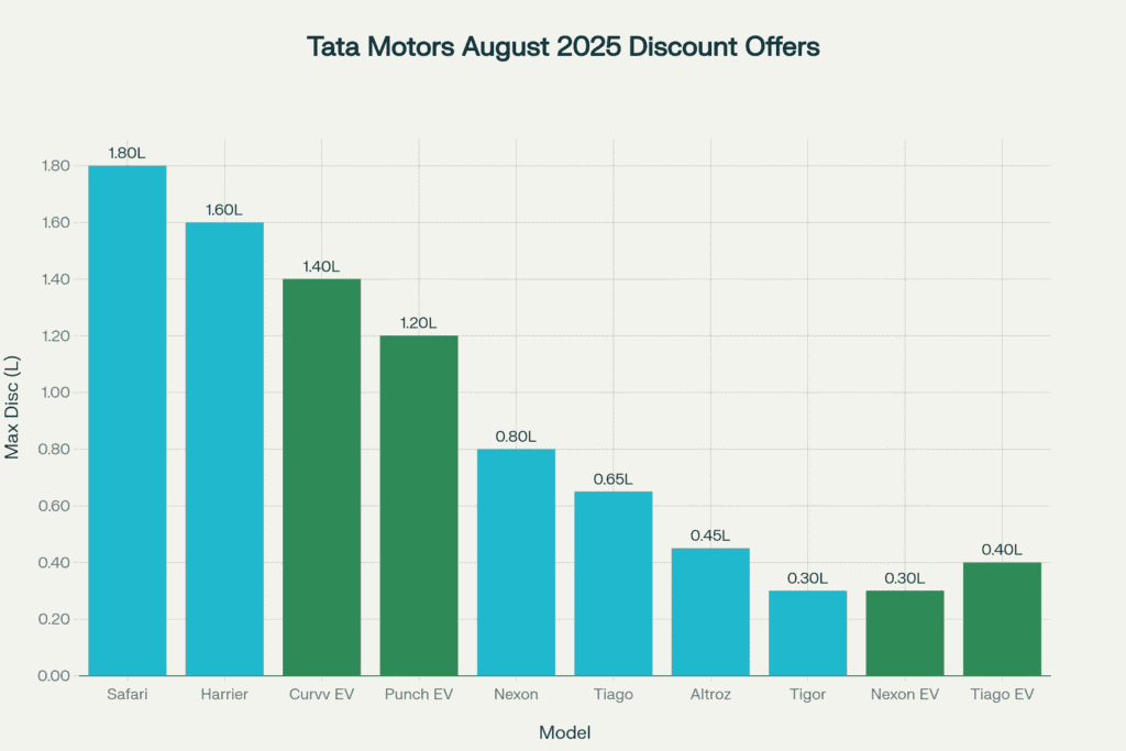 Tata Motors August 2025 discount offers across ICE and EV models, with Safari leading at ₹1.80 lakh maximum discount
